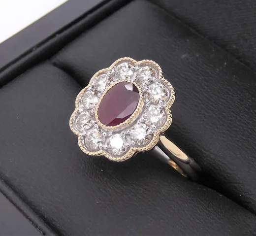 9ct gold ruby and diamond cluster ring, central oval ruby, surrounded by round brilliant cut diamonds, 0.89ct in total, set in 9ct yellow gold.