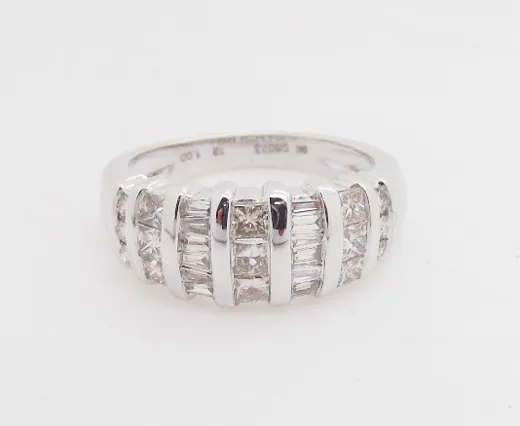 Fancy diamond band ring, set with round brilliant, princess and baguette cut diamonds, approximately 1.00ct, set in 9ct white gold.