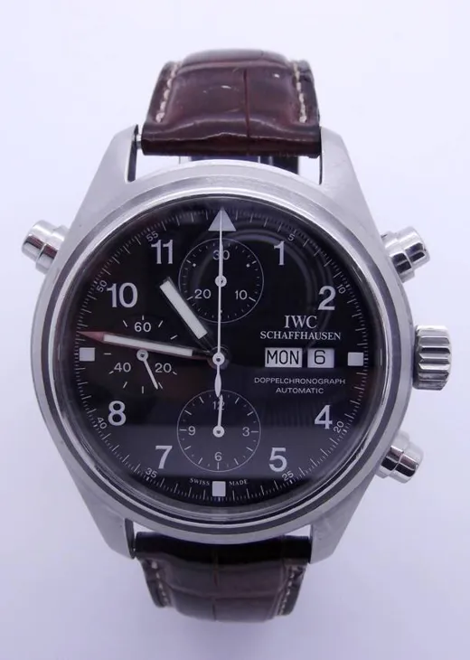 Pre-owned IWC Dopplechronograph, automatic movement, split time chronograph, stainless steel case, 42mm diameter, on brown leather strap, excellent condition, with box, no papers.