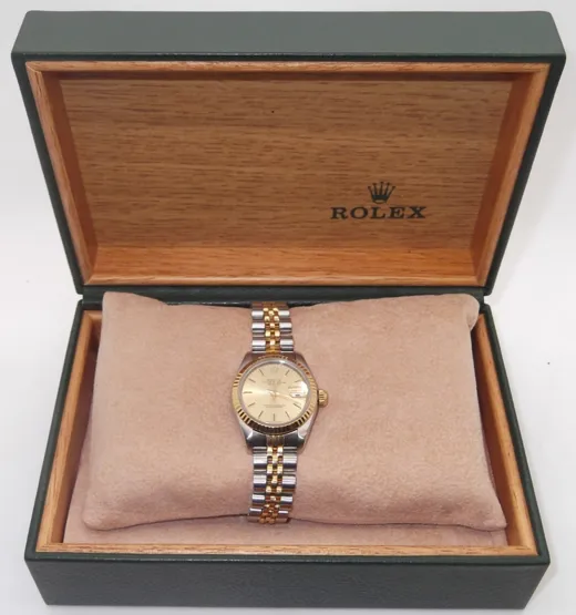 Ladies pre-owned Rolex Oyster Perpetual Datejust, bi-metal, automatic movement, sapphire crystal glass, stainless steel case with gold fluted bezel, stainless steel and gold jubilee bracelet, with box and replacement papers, dated 1986, excellent condition. REF.13461