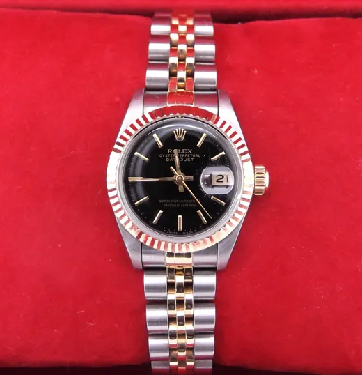 Pre-owned ladies Rolex Oyster Perpetual Datejust, automatic movement, stainless steel case, gold fluted bezel, black dial, sapphire crystal glass, stainless steel and gold Jubilee bracelet, with box and papers, dated 1991, superb condition. REF.16988