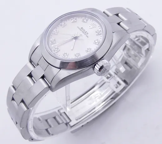Pre-owned ladies Rolex Oyster Perpetual non-date, stainless steel case, mother of pearl dial with diamond hour markers, automatic movement, stainless steel Oyster bracelet, with box and papers, dated 1997, excellent condition. REF.12763