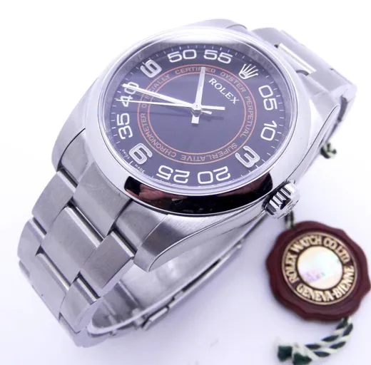 Pre-owned gentleman's Rolex Oyster Perpetual Non-Date, model 116000, stainless steel case, black and orange *Harley Davidson* dial, automatic movement, stainless steel Oyster bracelet with new style clasp, with box and papers dated March 2016, mint condition. REF.15234