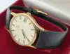 Vintage 1970's 9ct Gold Omega De Ville, automatic movement, , 9ct gold case, white dial with gold baton hour markers, black leather strap and extra gold plated expanding bracelet (non-Omega), with box and papers, dated 1977, good condition with a few scratches to acrylic glass. REF.16960
