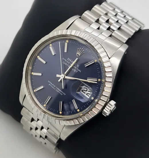 Pre-owned gentleman's Rolex Oyster Perpetual Datejust, automatic movement, blue dial with baton hour markers, acrylic crystal glass, stainless steel case with engine turned bezel, stainless steel Oyster bracelet, with box, no papers, very good condition, dated 1983.