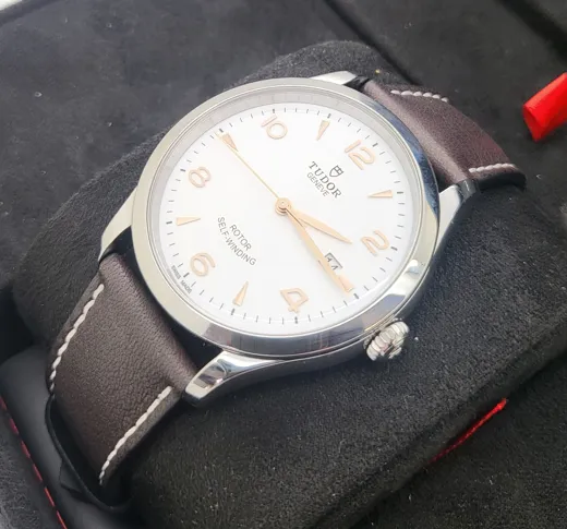Tudor 1926, 41mm diameter, automatic movement, 38 hour power reserve, white embossed dial with gold hour markers, stainless steel case, sapphire crystal glass, brown leather strap with folding clasp, with box and papers, dated February 2024, mint condition, Tudor warranty MRP. £1740.00.